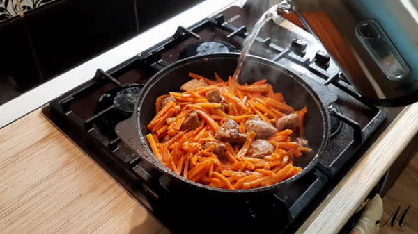 Как морковь прогрелась (можно даже рукой проверять, но осторожно), все перемешиваем и продолжаем жарить, минут 10-15. В это время у нас должен кипятиться чайник. Ведь следующим шагом, нам надо будет залить всё содержимое казана ГОРЯЧЕЙ водой, так, что бы ей уровень был примерно на 1см выше продуктов. Туда же отправляем горький перец в стручках, убавляем плиту на минимум и закрываем крышкой. Оставляем всё это дело тушиться, примерно на час.