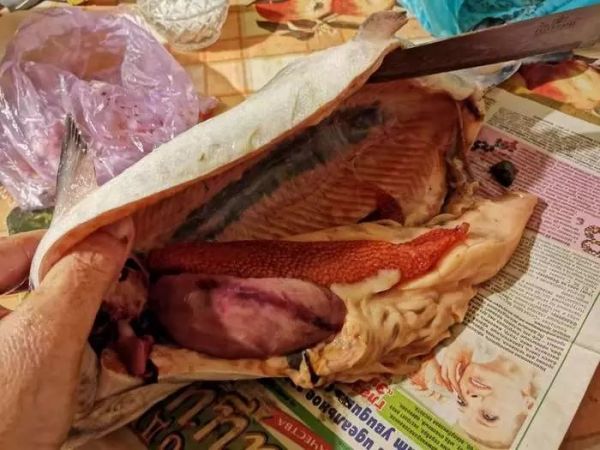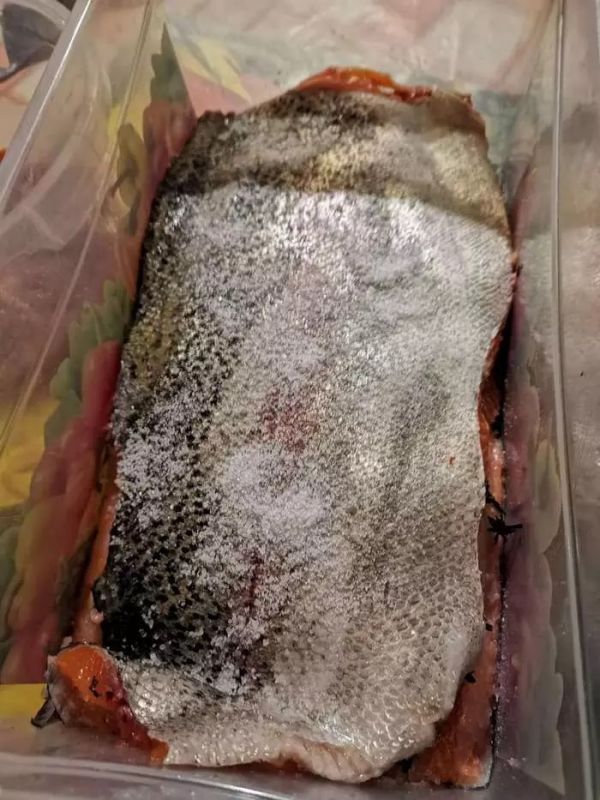 Наступила холодная погода и опять начали возить охлаждённую форель из Карелии. Ещё один плюс этой рыбы, что она не потрошённая и почти вся с икрой. Икра пока ещё незрелая, но кушать её уже можно. Многие эту форель режут на стейки, а затем всякими способами жарят. Я считаю это варварством! Форель просто создана для посола, с минимальным набором пряностей, а из костей, хвоста и головы получится превосходная уха.