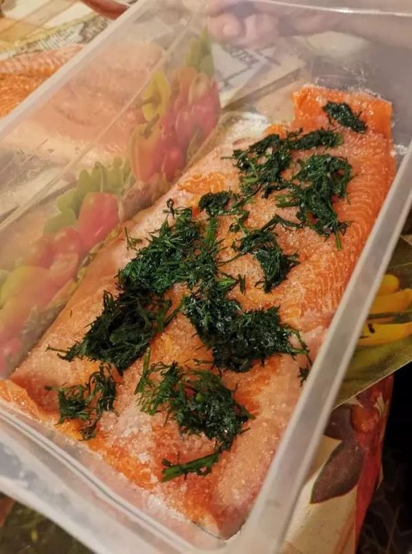 Взвешиваем каждое филе по отдельности. На каждый килограмм филе идет 50 гр соли и 20 гр сахара. Пряности - укроп. Это скандинавский способ посола. В европейском, вместо укропа применяют душистый перец. Много пряностей не надо, иначе они забьют вкус рыбы.