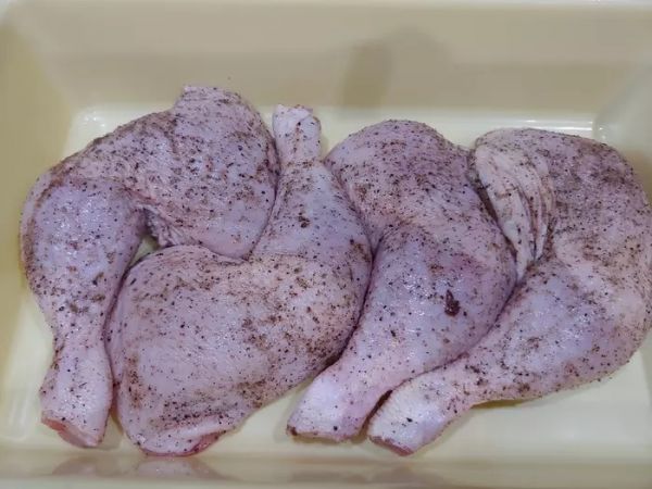 Для этого килограмма окорочков я взвесил и смешал 15 грамм обычной поваренной соли, 3 грамма сахара и 2 грамма чёрного перца. Полученной смесь натер окорочка со всех сторон и отправил на ночь на нижнюю полку холодильника.