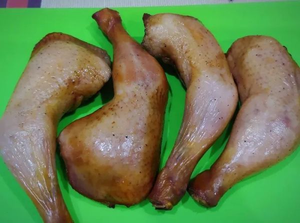 Горячие - они похожи на копченые окорочка с тонкой хрустящей шкуркой и розовой мякотью. После охлаждения они, совершенно неожиданно превращаются в куриную ветчину. Такие вот ленивые ноженьки.