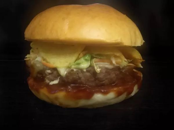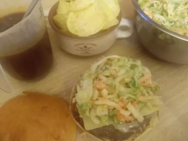 На нижнюю булочку выкладываем барбекю, затем котлету с сыром, снова немного барбекю и коулслоу. Сверху салата кладем по несколько ломтиков картофельных чипсов. И накрываем булочкой.