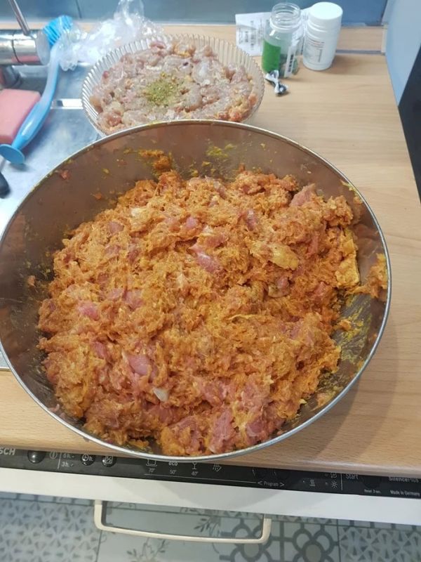 Итак, берем поровну мясо грудки индейки и бедро её же. И то, и то для начала режем кусочками средними и маринуем в посуде. Маринад стандартный. Соль, перец, специи. Поскольку под варку и жарку, то нитритную соль не использовал. Обычная соль, 18гр на кг сырья. Замешиваем, даем постоять сутки в прохладном месте.