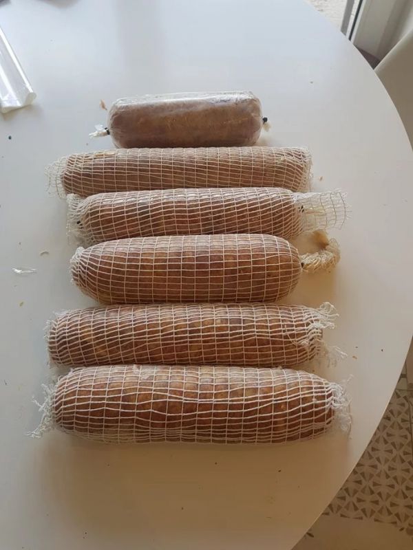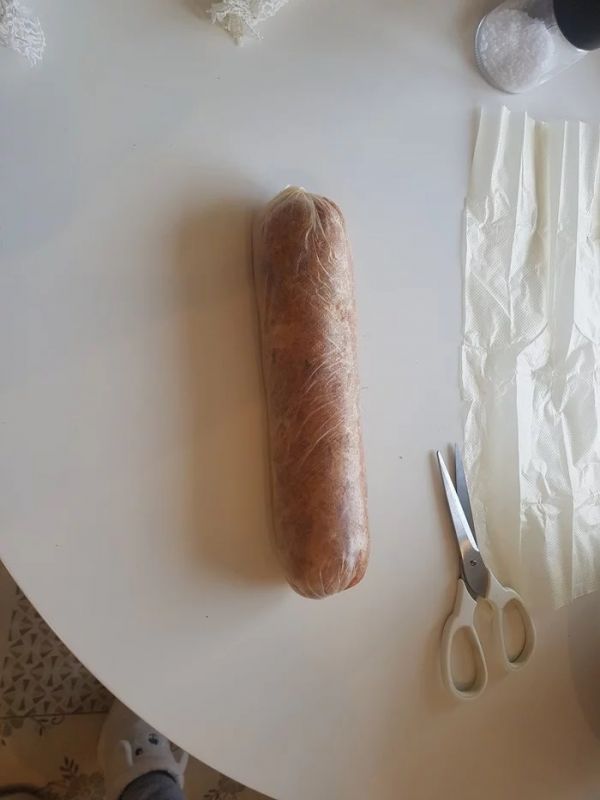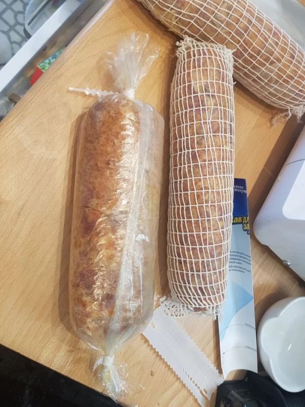 Далее для формирования колбас есть варианты. У нас было некоторое количество коллагеновой пленки. В ней получалось так: