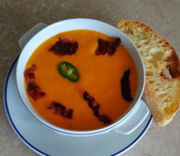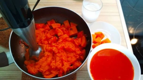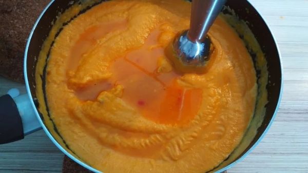 Бульона можете налить меньше, если хотите сделать суп более густым. Можно для цвета добавить копченой паприки. Я не стал, так как мне понравился ярко оранжевый, апельсиновый цвет супа.