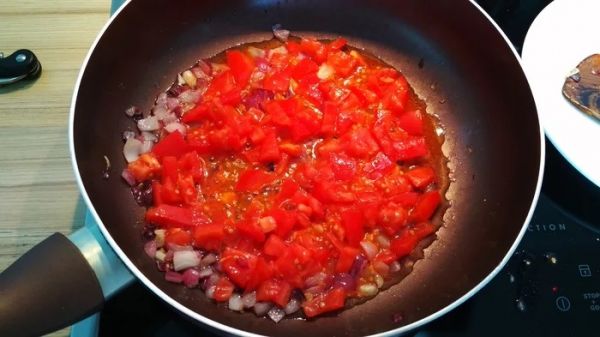 Кладем к луку мелко порезанный кубиками помидор и обжариваем пару минут.