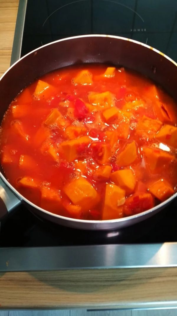 Затем заливаем все бульоном, чтобы овощи были покрыты и варим под крышкой, на среднем огне до мягкости тыквы (25 минут).