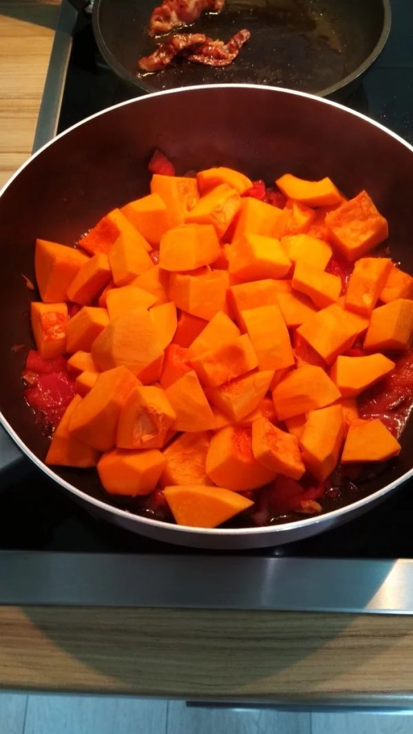 Добавляем порезанную кубиками (2х2 см) тыкву и обжариваем минуты три.