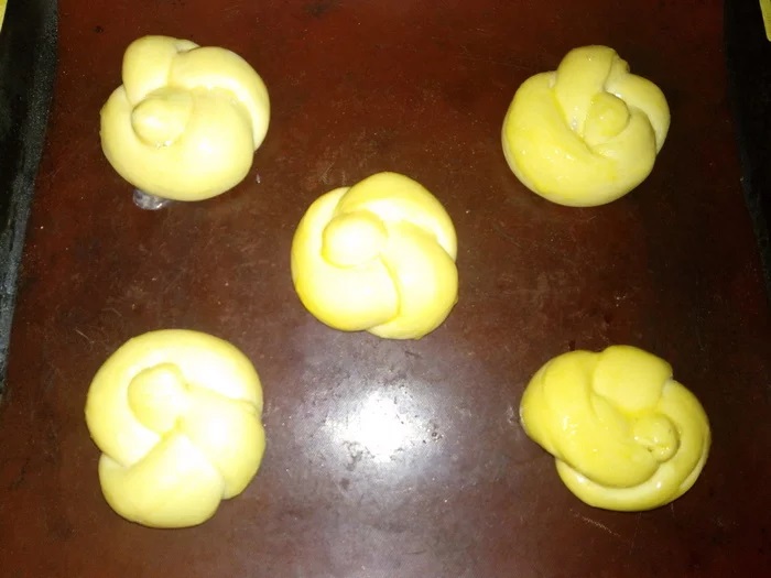 Разделить тесто на 10 кусочков примерно по 80 гр. Скатать каждый кусочек в жгут длиной 20-25 см. Завязать узлом, добавив еще несколько витков (как получится). Оставить на расстойку в 60 минут при комнатной температуре. Перед выпечкой смазать яйцом.