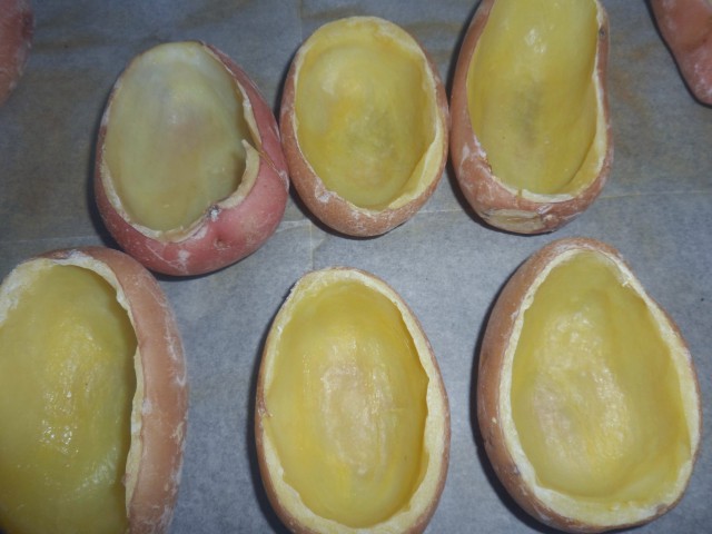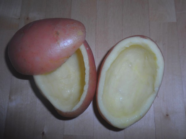 Обозрев всё это великолепие, я засучил рукава и, не успев, как следует удивиться тому, откуда умею кухарничать, шустро приступил к готовке.С сырого картофеля срезал крышку и принялся вырезать, а затем выковыривать «мякоть». Зачем я это делаю?.. Не знаю…Но, чувствую, что так надо…