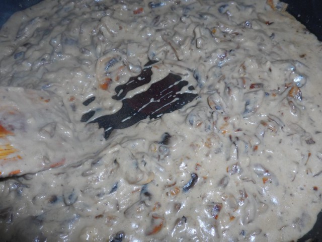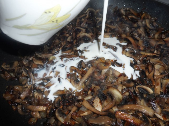 В готовые грибы с луком вливаю сливки, солю, перчу, добавляю муку, перемешиваю, добиваясь нужной густоты.