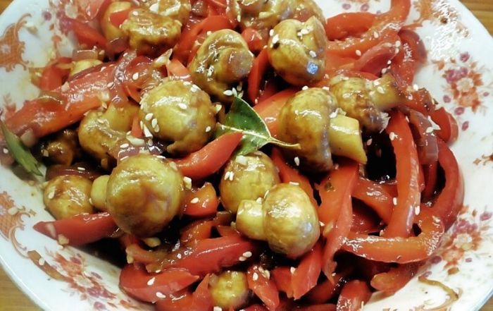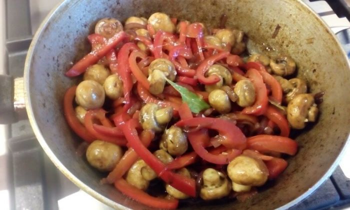 Спустя еще 5 минут, перекладываем грибы к перцу с луком, добавляем лавровый лист и мелко порезанный зубчик чеснока. Перемешиваем.Перец в конечном итоге должен остаться слегка хрустящим плотным внутри (не прожаривайте его до мягкости иначе всё превратится в кашу - перец должен остаться полосками, как мы его и нарезали)