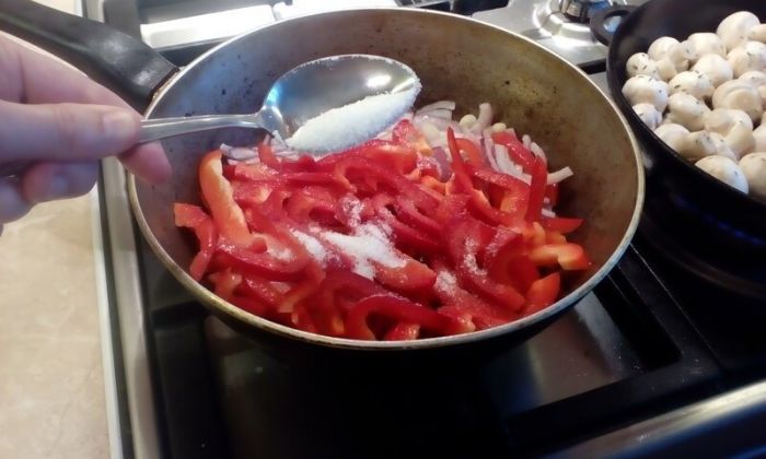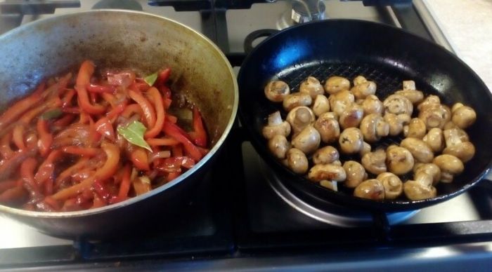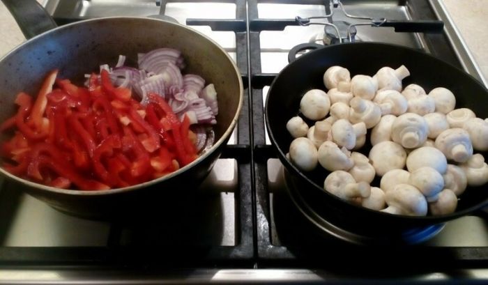 Выкладываем на одну разогретую сковороду перец с луком, а на вторую шампиньоны - на большой огонь.С грибами наша задача обжарить их так, чтобы снаружи у них появилась румяная корочка, а внутри они остались сочными и хрустящими. В процессе обжаривания ближе к концу грибы подсаливаем по вкусу, а также можно добавить тимьян для аромата