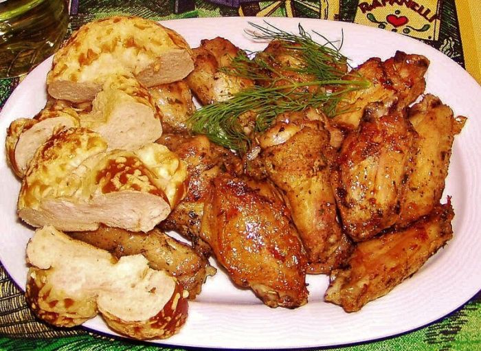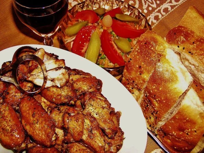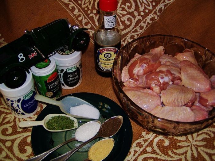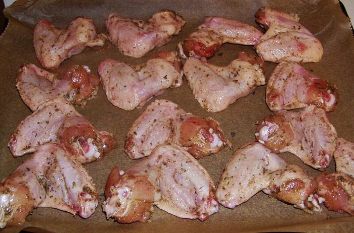 Итак, для приличия сначала напишу рецепт.Покупаем 12-15 штук крылышек. Моем их хорошенько и удаляем остатки пуха и перьев. Обсушиваем их бумажными полотенцами очень тщательно. В это время у нас уже разогревается духовка, поставленная на 200 градусов и с поддувом. В таком случае фактическая температура должна достигнуть 220-ти градусов.