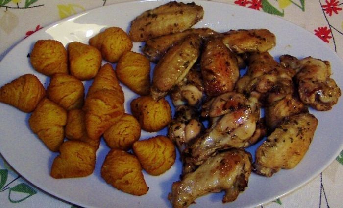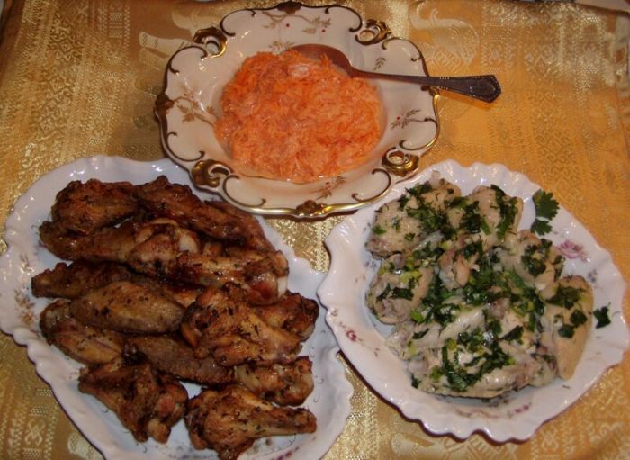 Если мне попадаются крылышки мелкого калибра, то время готовки сокращается. Так что не 25 минут, а 23. Не пересушите мяско. Иногда параллельно я отвариваю крылышки и мариную их в свежих травах и натёртом на мелкой тёрке чесноке. Кинза и укроп - очень хорошо. На гарнир - тёртая морковь со сметаной и сахаром.