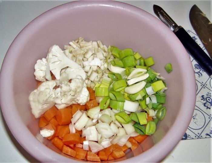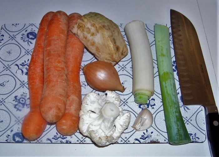 В это время нарезаем средним кубиком морковь, кусочек корня сельдерея, лук-порей (можно заменить половинкой луковицы), зубчик чеснока. Я также добавляю немного капусты – всё равно какой, с нею вкус становится как-то сердечнее. Маленькая жменька нарезанной белокочанной будет хороша точно так же, как и розочка цветной у меня на фотке.