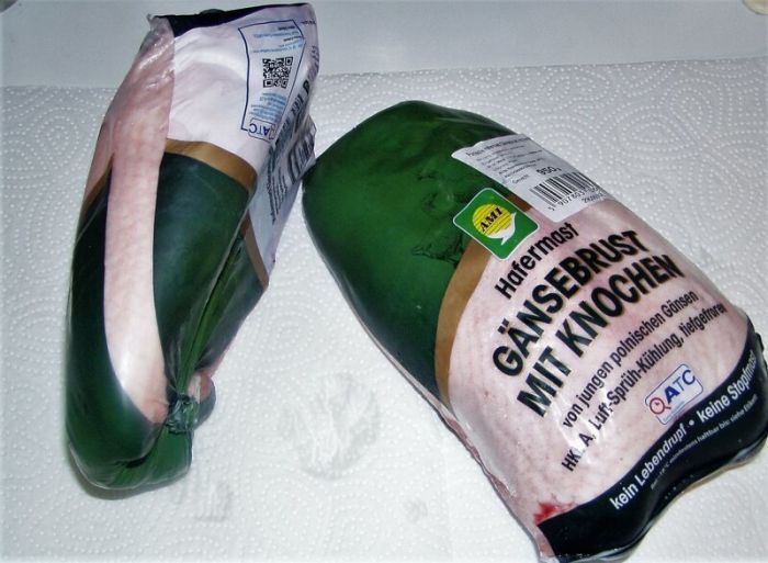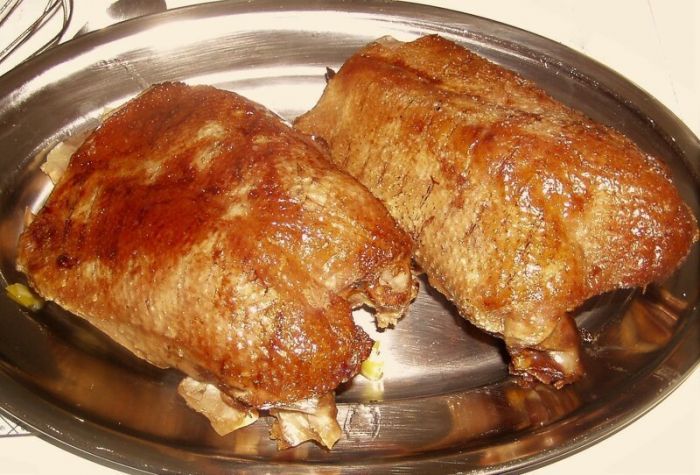 С гусиной грудкой мы поступим немного иначе. Раскочегариваем духовку на 200 градусов и с поддувом. Температура в таком случае из-за поддува становится фактически 220 градусов. Кладём грудку КОЖЕЙ ВНИЗ на РЕШЁТКУ и задвигаем в духовку на средние полозья. Берём ПУСТОЙ ПРОТИВЕНЬ и задвигаем в духовку одними полозьями ниже. Оставляем вытапливаться ровно 20 минут.