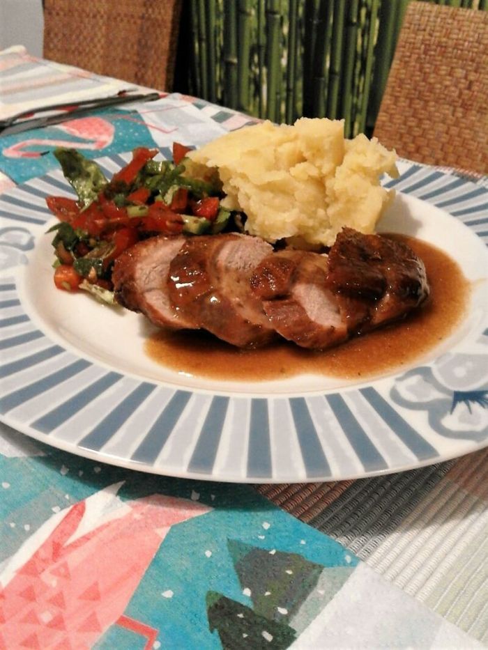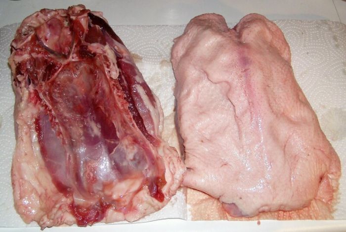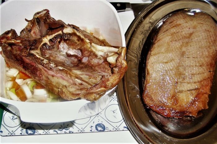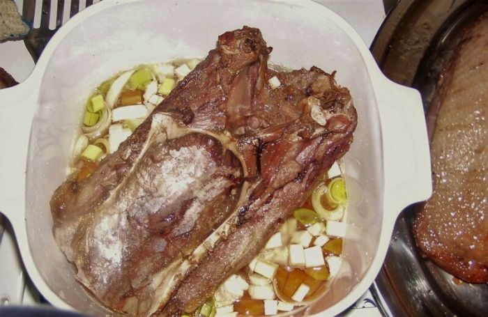 Его можно просто намазать на хлеб, присолить – и вперёд. Немцы, кстати, такое яство очень уважают. А если ещё лучка тонко нарезанного, да пластиночку чеснока... Да, и перчиком красным присыпать, ай-яй-яй... Тээээкс, на чём я остановился? Ага, присаливаем мясо слегка, кладём грудку КОЖЕЙ ВНИЗ в ёмкость для запекания на подушку из овощей и вливаем воды, чтоб полностью покрыла овощи. Хорошо бы ещё полстаканчика вина туда же, но увы! – не было. Вернее, было, но уже не в бутылке... В духовку на 30 минут. Потом достаём, переворачиваем кожей вверх, и ещё на 30 минут в духовку.
