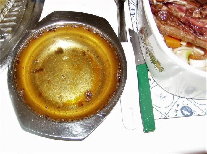 С противня сливаем жир в мисочку. Посмотрите, какая красота! Видно, что мясного сока выжарилось совсем немного (тёмные пятна - это сок) а гусиный жир после охлаждения отправится в холодильник для дальнейшего использования. Когда он застынет, то станет белоснежного цвета.