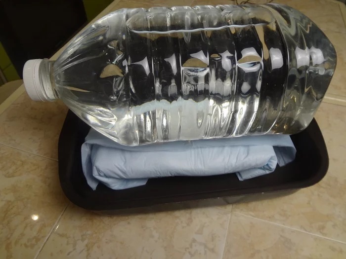 Теперь нужно спрессовать мясо и убрать лишнюю влагу. Оборачиваем мясо в свежую одноразовую пеленку, кладём под груз на 1 сутки в холодильник.