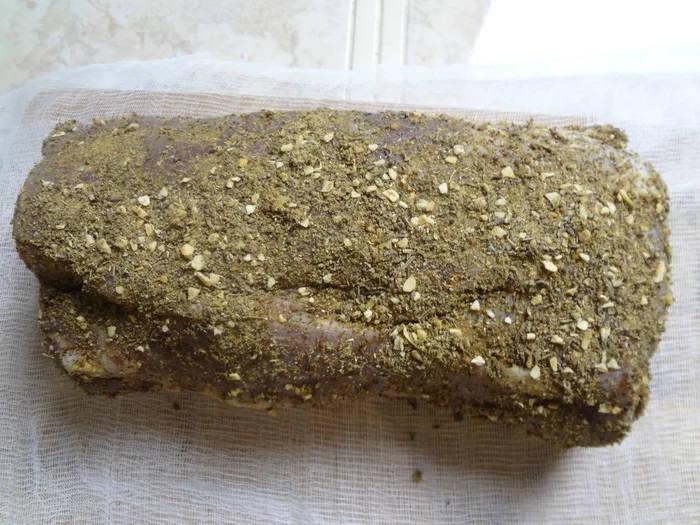 Через сутки достаём плоский, сухой кусок мяса. Обмазываем его лимонным соком, а потом специями. Заворачиваем в марлю.
