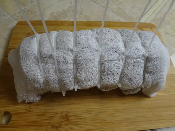 Я не использую верёвку или резинки. Чтобы спрессовать мясо и придать круглую форму я использую стяжки. Я соединил 3 маленьких, чтобы обернуть мясо, но вы лучше заранее ищите длинные. Это очень удобно т.к. по мере потери веса, мы можем утягивать мясо стяжками, придавая ему правильную форму.