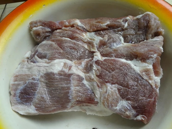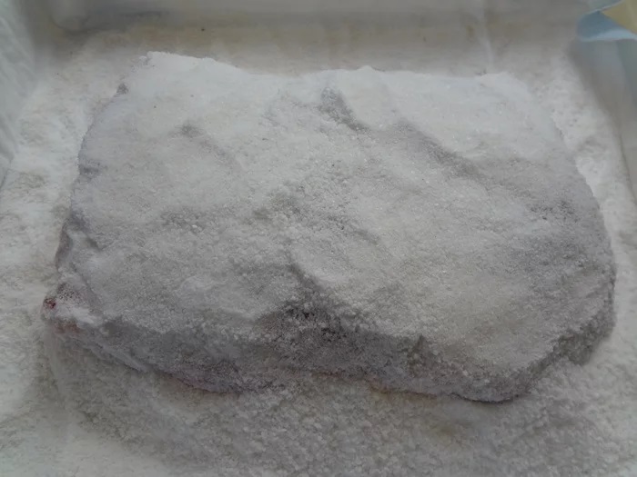 Берём свиную шею, примерно 1,5 кг. Для удобства на дно контейнера я постелил одноразовую, детскую пелёнку. Стоят они не дорого - 38 рублей за 5 шт. Посыпаем на нёё соль, кладём мясо и сверху сыпем оставшуюся соль. Соль должна покрывать мясо со всех сторон. Пелёнка поможет впитать всю лишнюю жидкость и нам не придется её постоянно сливать. Отправляем в холодильник на 3-е суток.