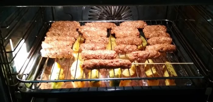 Колбаски выложить на решетку и установить над поддоном с картофелем.