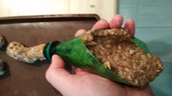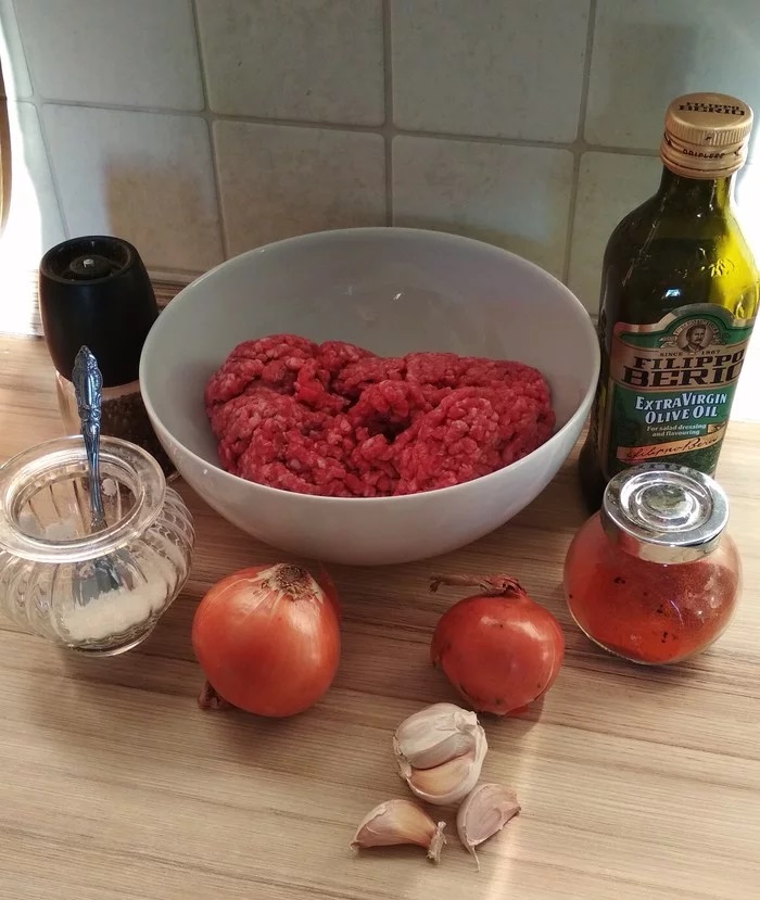 Подготовьте фарш (говяжий либо свинина+говядина) - пропустите через мясорубку. Добавьте в фарш паприку, соль, черный перец и мелко порезанный лук (или смолотый в блендере), хорошо перемешайте. Влейте в фарш минеральную воду и старательно вымешивайте фарш руками в течение 10 минут. Затем смажьте фарш оливковым маслом так, чтобы оно покрыло всю поверхность и создало масляную пленку, которая не даст фаршу заветриться. Или затяните пищевой пленкой. Уберите фарш в холодильник на несколько часов, а лучше на ночь.Обрежьте горлышко у пластиковой бутылки, оно понадобится для формовки чевапчичей. Фарш еще раз перемешайте руками, наполните горлышко бутылки фаршем и, проталкивая его через отверстие, выложите колбаски на разделочную доску.