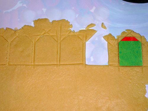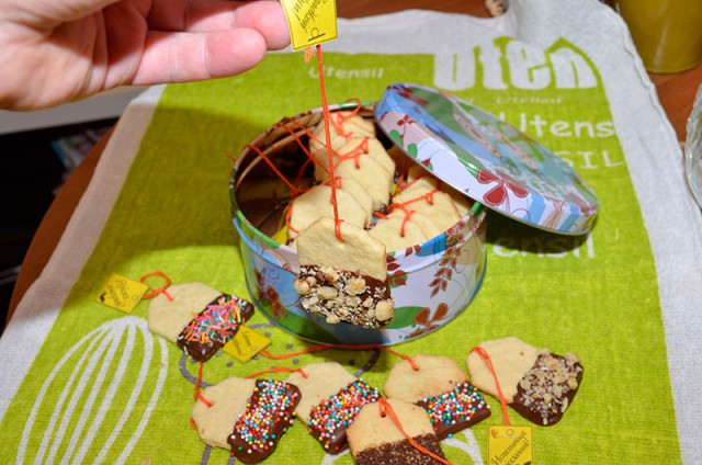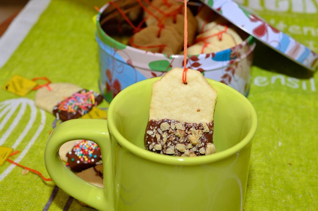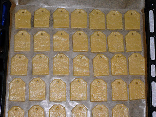 Из картона вырезать трафарет в форме чайного пакетика. Тесто раскатать в пласт, толщиной 0,5 см и вырезать из него заготовки печений.