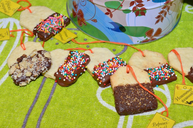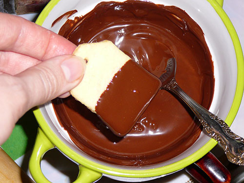 Выпекать печенье, в разогретом до 180 градусов Цельсия духовом шкафу, в течение 10-15 минут.В микроволновой печи или на водяной бане растопить шоколад. Обмакивать печенье в шоколад до середины.