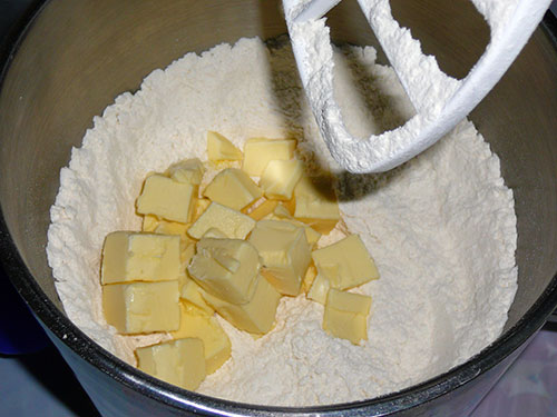 Рецепт приготовления:Муку просеять с солью в миску миксера, добавить размягченное сливочное масло и смешать до образования мелкой крупки.