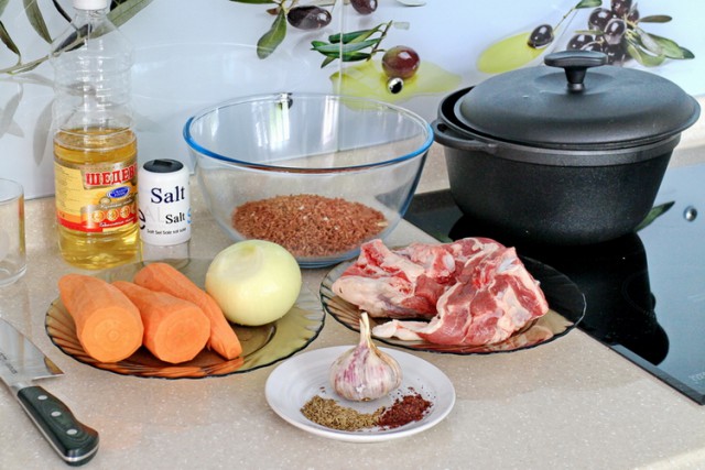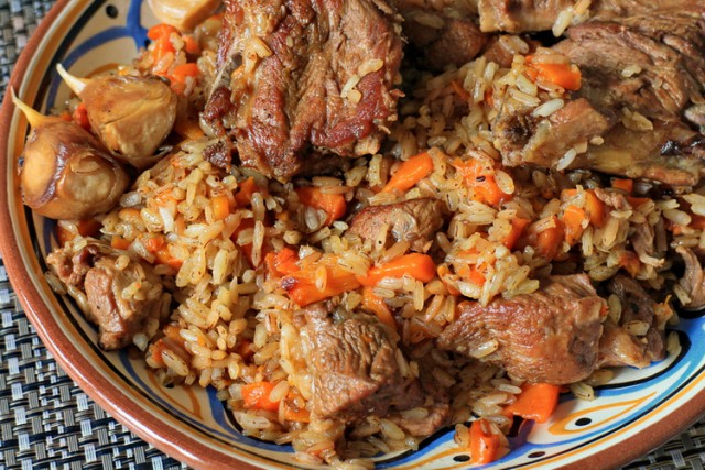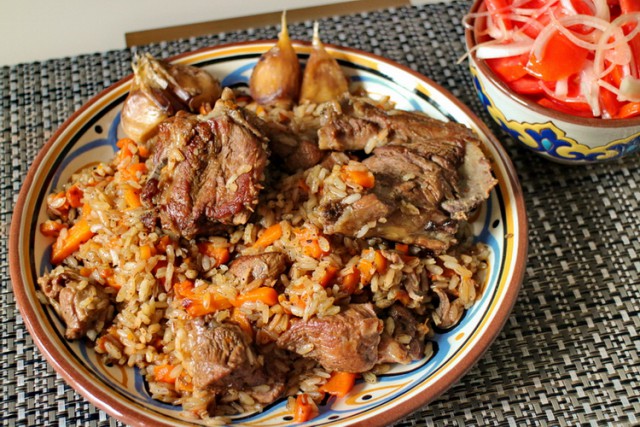 Состав : мясо баранина, лук, морковь, рис девзира, чеснок, масло, специи: зира, перец, барбарис; казанок чугунный, шумовка, плита.