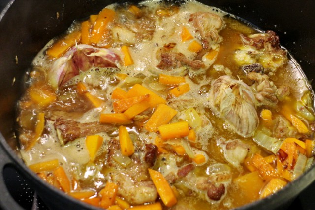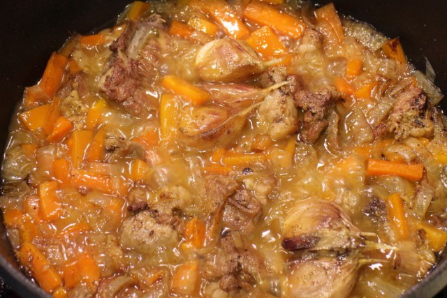 Вернул в казан косточки, положил чеснок, предварительно отрезав ему "дно", довел зирвак до кипения и оставил на час тушиться на среднем "огне", под крышкой.