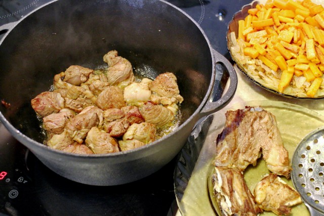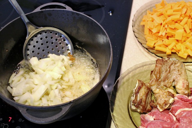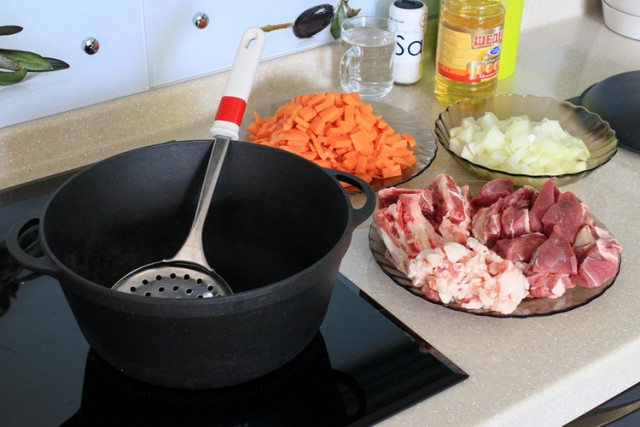 Лук доводим до золотистого цвета, вынимаем из казана шумовкой, затем морковь - до мягкого и поджаристого состояния, и тоже вытаскиваем. Последним обжариваю мясо.Конечно, можно не вытаскивать лук, с ним сразу в казане обжарить мясо, добавить морковь... Но это если у вас казан большой, много простора и широкое круглое дно, на нем легче все помешивать и контролировать, чтобы не подгорело. В маленьких казанах с плоским дном проще готовить все отдельно.