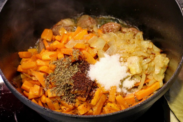 Мясо обжарилось - возвращаем в казан морковку, лук, добавляем специи, соль (на это количество 2 чайные ложки). Обжариваем все минутку-другую, затем добавляем воду, чтобы получился зирвак. Воды добавляю столько же, сколько и сухого риса: у меня было 2 чашки риса, я добавил 2 чашки воды.