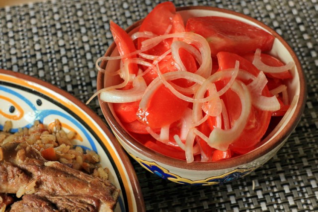 Доводим зирвак до кипения, закрываем крышкой, делаем минимальный "огонь", и на минимальном "огне" готовим 30 минут. Затем выключаем казан и не открываем его полчаса. В это время делаем салат из помидор и лука - "Ачичук""В узбекском языке нет единого названия салатов. По вкусу и питательным свойствам это блюдо, например в Ферганской долине, называют «шакароб», в Ташкентской области — «аччик-чучук»"