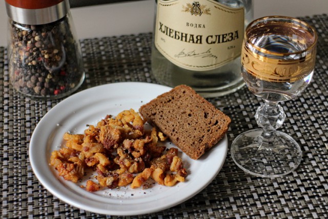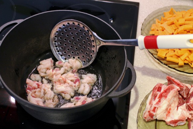 Обжарили косточки до золотистого цвета, вытаскиваем их и шкварки из казана, и кладем в него лук.Косточки на тарелку, они нам еще понадобятся, а вот шкварки...