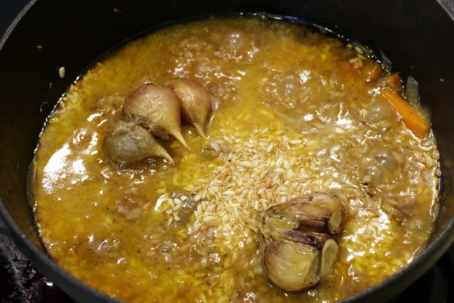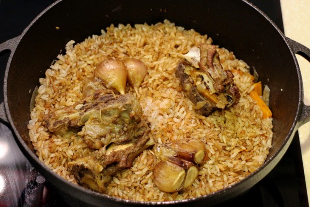 Вытаскиваем чеснок и кости, добавляем рис, поверх риса обратно кладем наши кости и рис. Воду не добавляем! Ее достаточно в казане