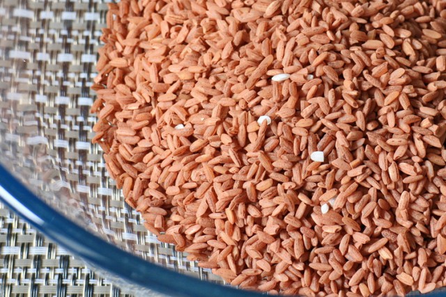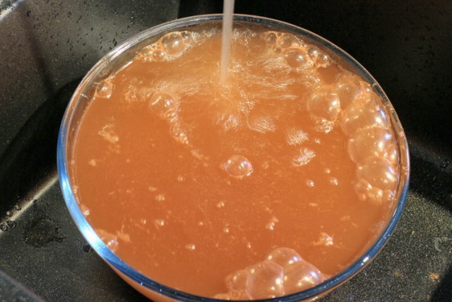 Затем хорошо промываем рис. Офигеваем сначала от "ржавой" воды, затем от результата. Задумываемся... а не покрашен ли рис? :) На рынке бывает очень много ушлых продавцов, добавляющих обычный рис в девзиру, чтобы тот покрасился, потому желательно запомнить продавца, чтобы если что, заскочить в гости, "угостить пловом" :spiteful: Проверяется осмотром промытого риса - если много чистых рисинок без полосок, пора в гости :)