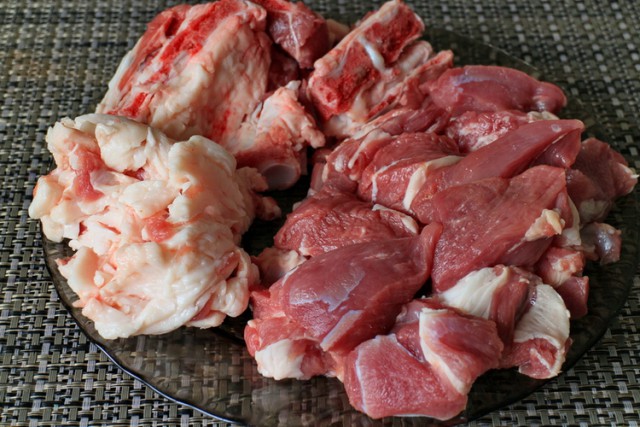 Мясо отделяем от костей и жира, крупно режем. Жир мелко режем, кости не трогаем. Нам все пригодится.