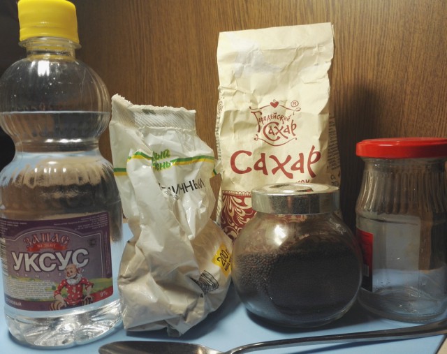 Начинается все невинно. Горчица, сахар, уксус, семена горчицы, пустая тара... За кадром осталось растительное масло. Обратите внимание - все продукты самые обычные, горчичный порошок вообще дешевка.