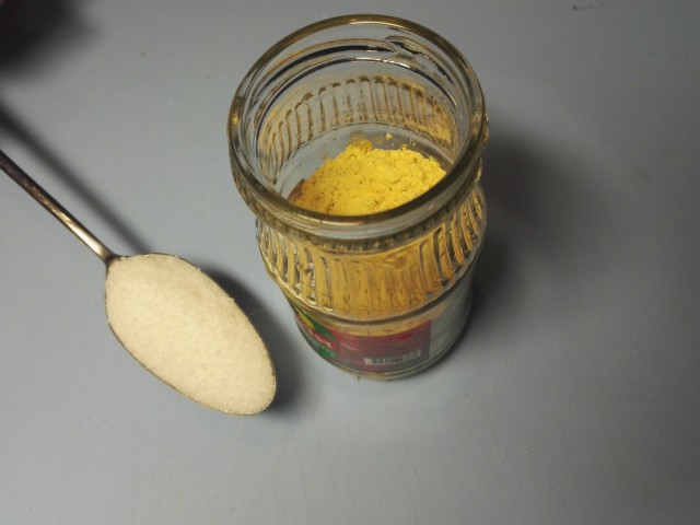 В баночку всыпаем 4 столовых ложки горчицы (с горкой), затем сахар...