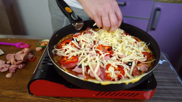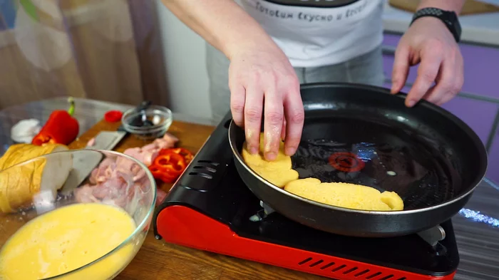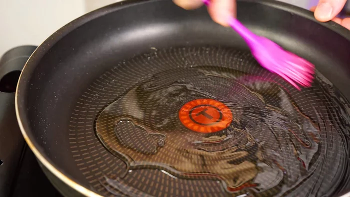 Смазываем, обильно, сковороду растительным маслом.