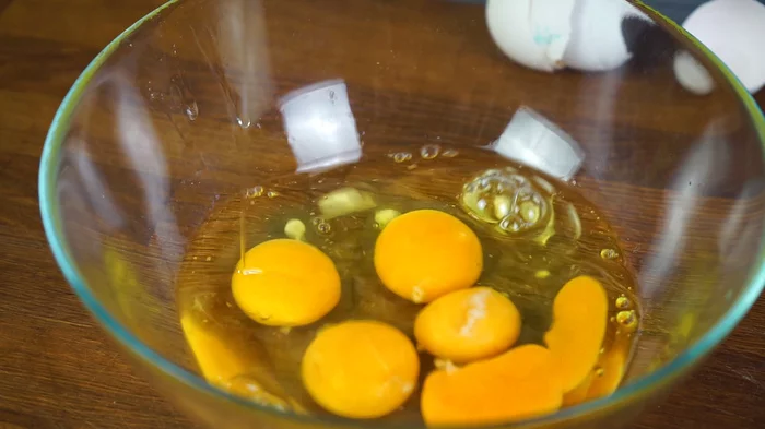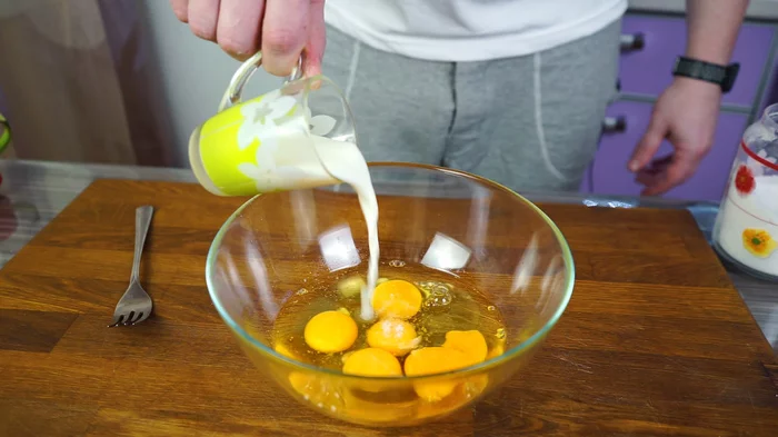 Смешиваем 5 куриных яиц с 70 мл. молока (жирность особого значения не имеет) и солим (1/2 чайной ложки).