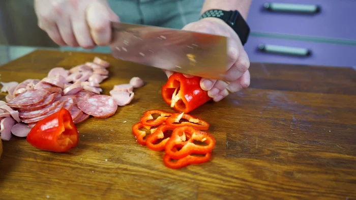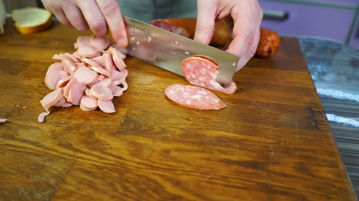 - Шинкуем колбаску, сосиски.