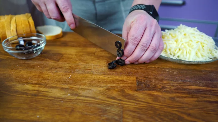 - Нарезаем маслины и болгарский перец.