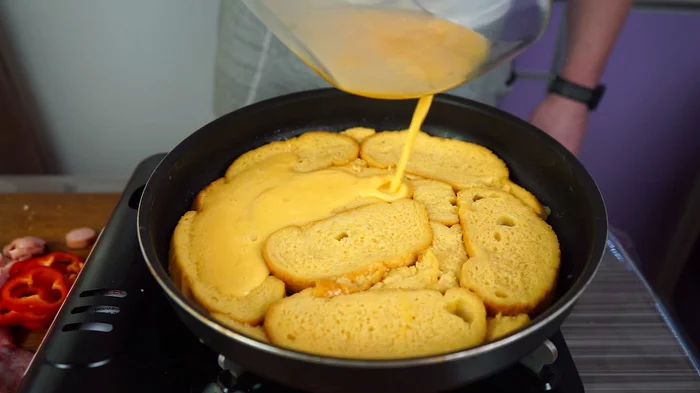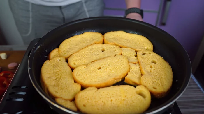 Окунаем ломтики батона, полностью, в яично-молочную смесь и выкладываем на холодную сковороду.
