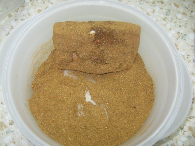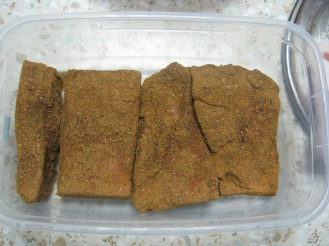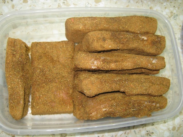 Обваливаем брусочки сала со всех сторон в приправе (типа панировка)