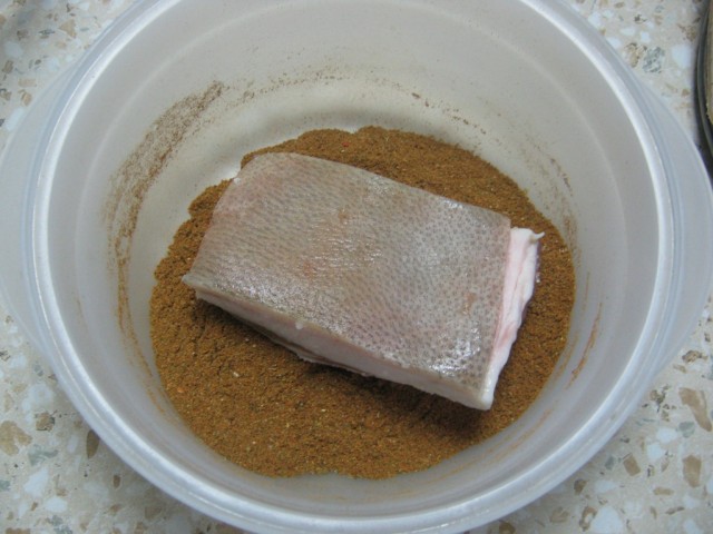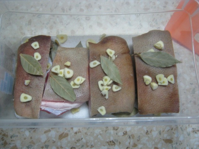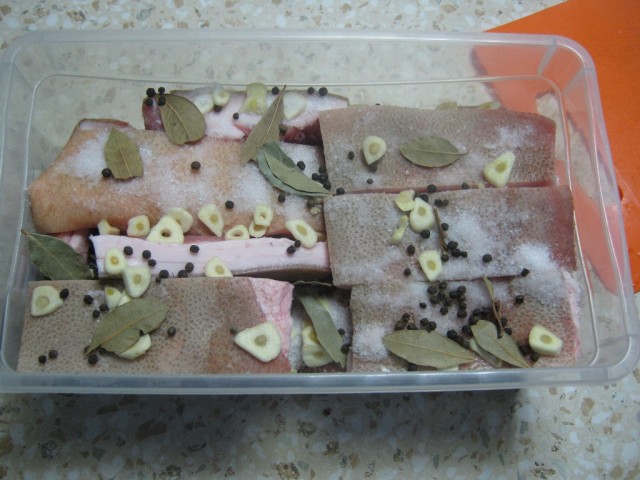 Укладываем сало в контейнер шкуркой вверх